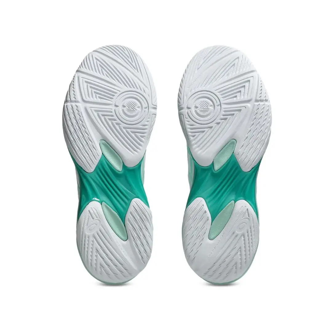 1072A119.104 Entrena con comodidad y estabilidad usando los ASICS W GEL-Rocket 12 Blanco con Verde, tenis deportivos para mujer diseñados para absorción de impactos y movimientos rápidos.